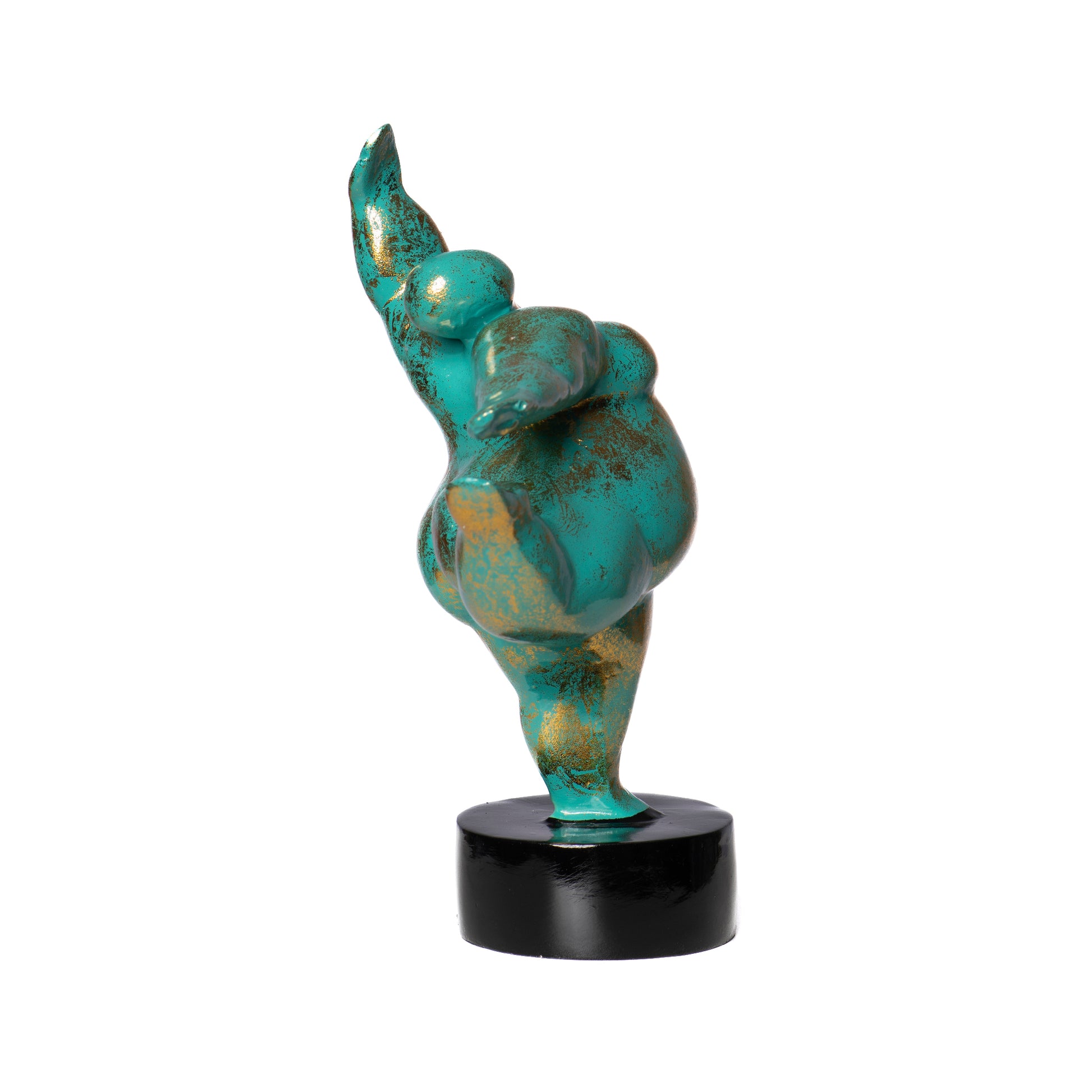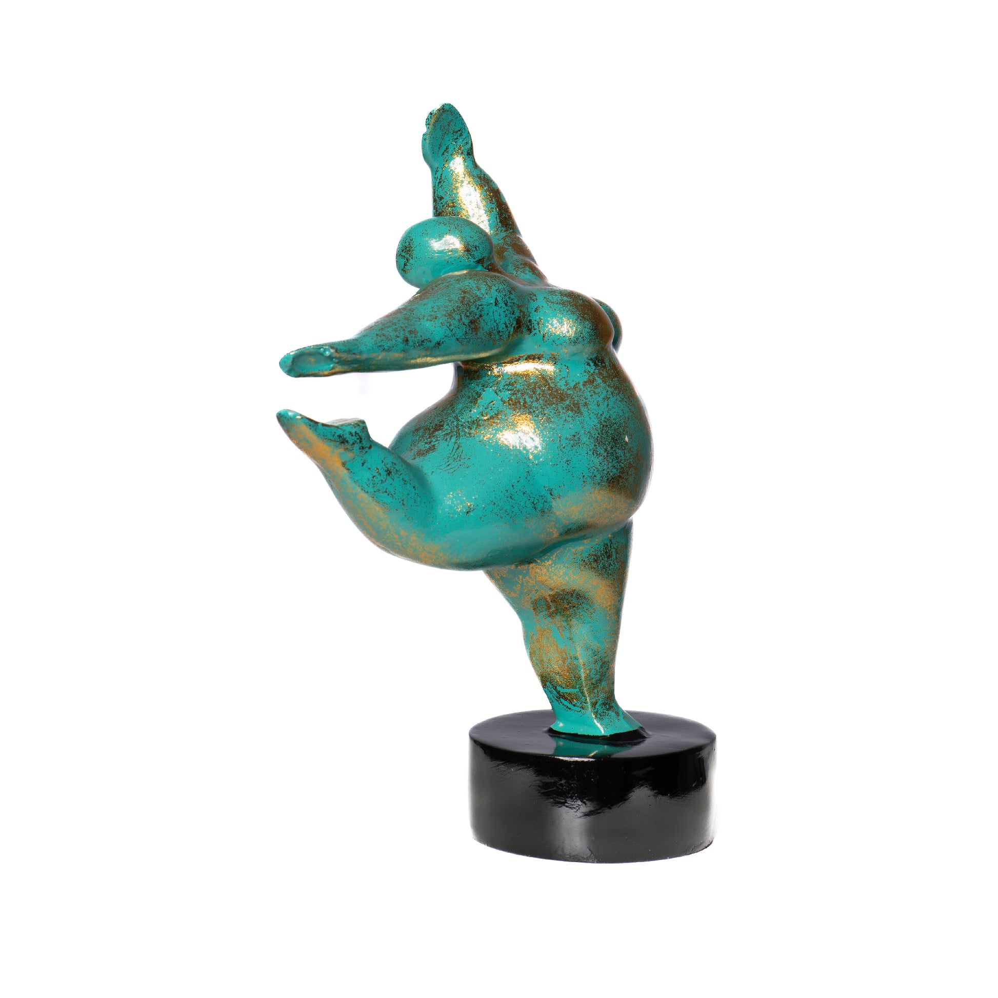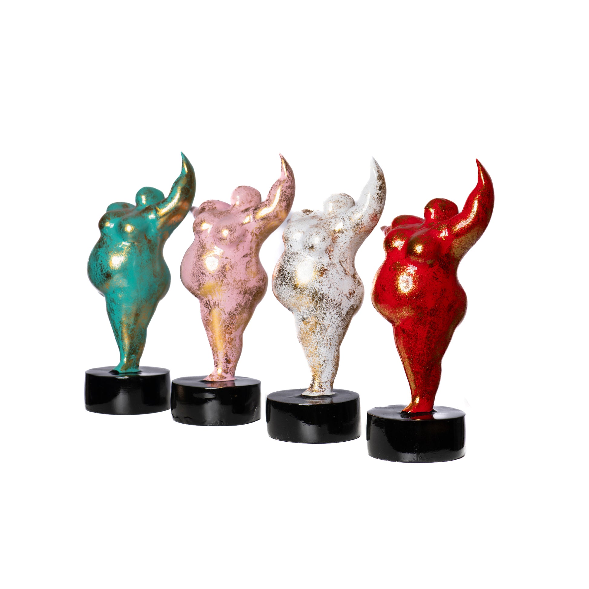 Statuette in resina a forma di ballerine, dipinte con finitura dorata. I loro corpi sono catturati in un momento sospeso mentre eseguono un passo di danza.