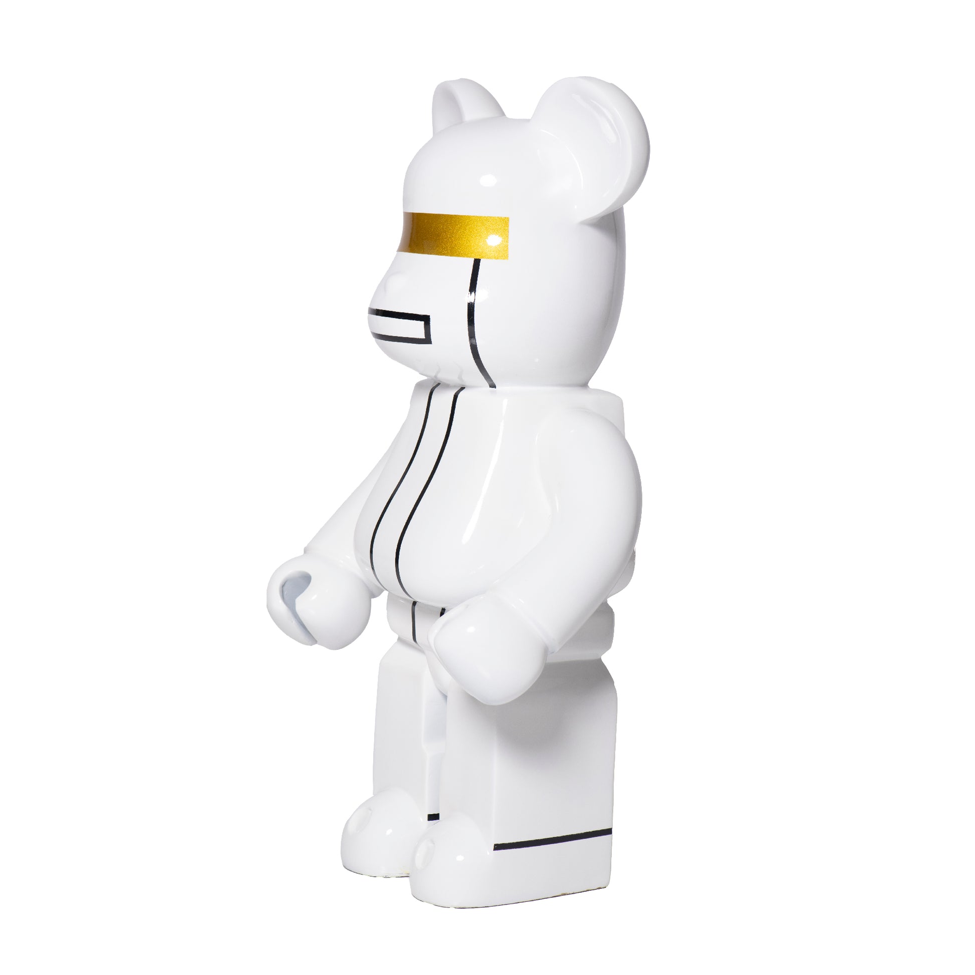 Statua di Bearbrick, l'iconica figura a forma di orsetto stilizzato, realizzata in resina con una combinazione di colori elegante e sofisticata. La statua ha la classica forma geometrica e minimalista che contraddistingue il design di Bearbrick, con le sue linee semplici, il corpo squadrato e le orecchie rotonde, ma i colori scelti la rendono un vero oggetto di lusso e di tendenza.