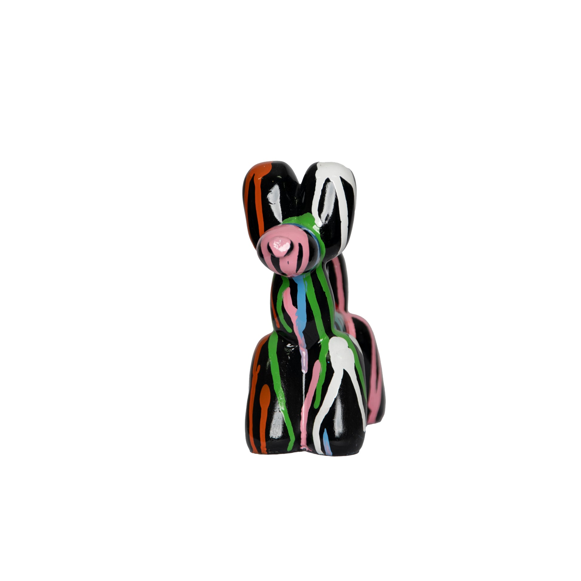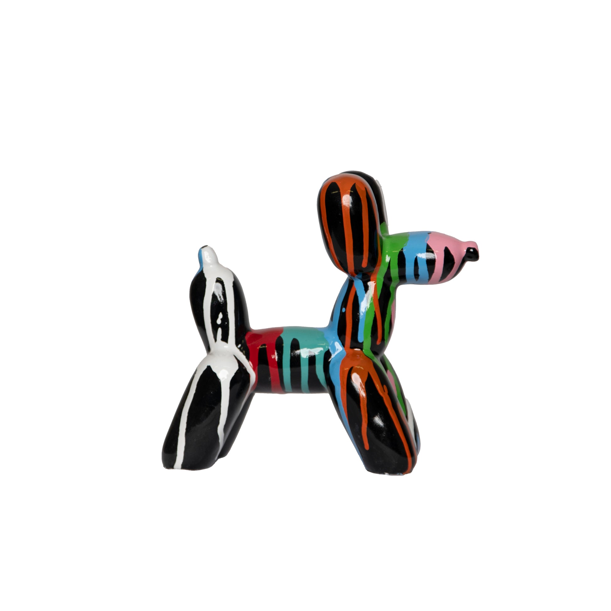 Statuetta in resina a forma di cane palloncino. Il mix di colori sgargianti accentua la tridimensionalità della scultura, donandole un aspetto giocoso e contemporaneo, perfetto per un ambiente artistico o di design.