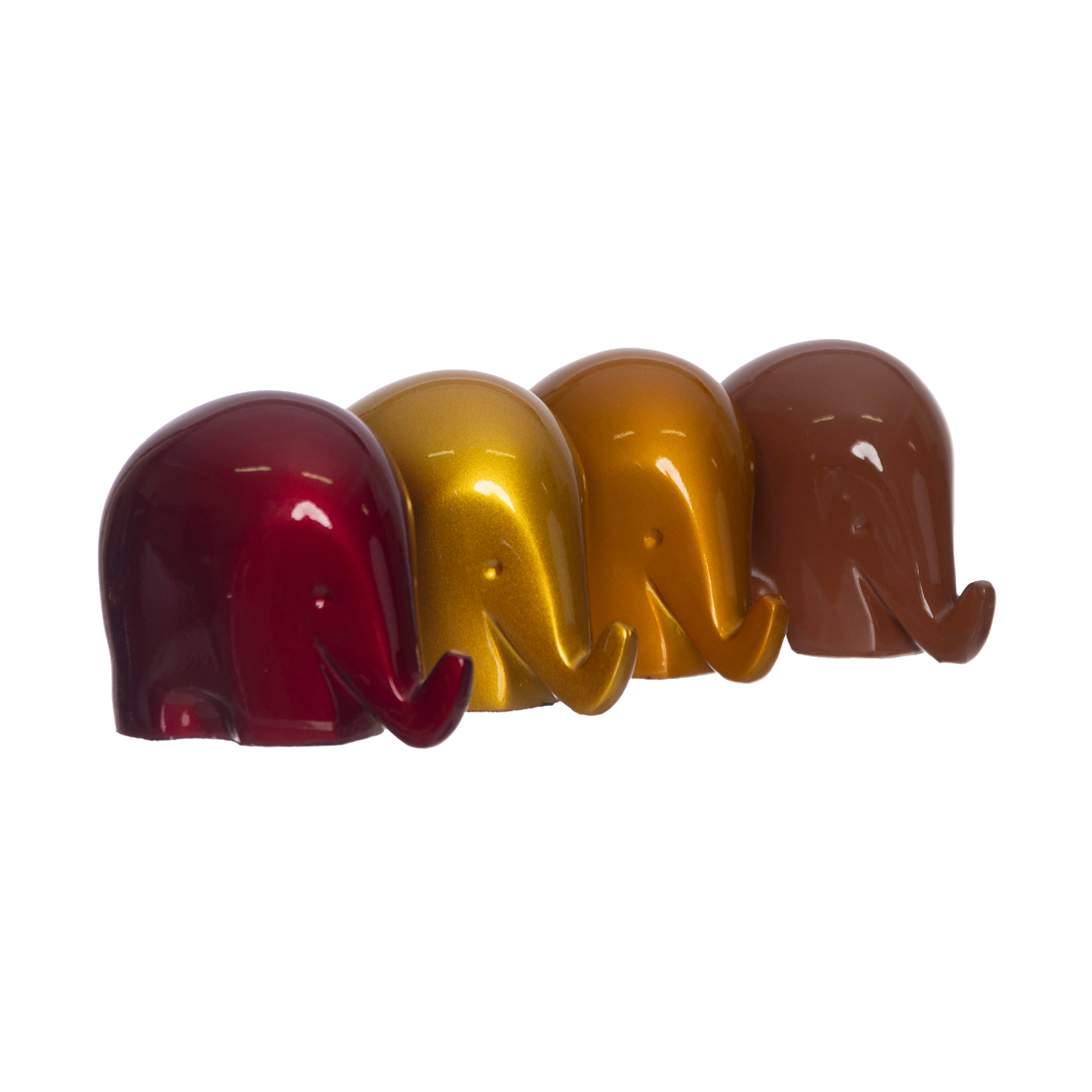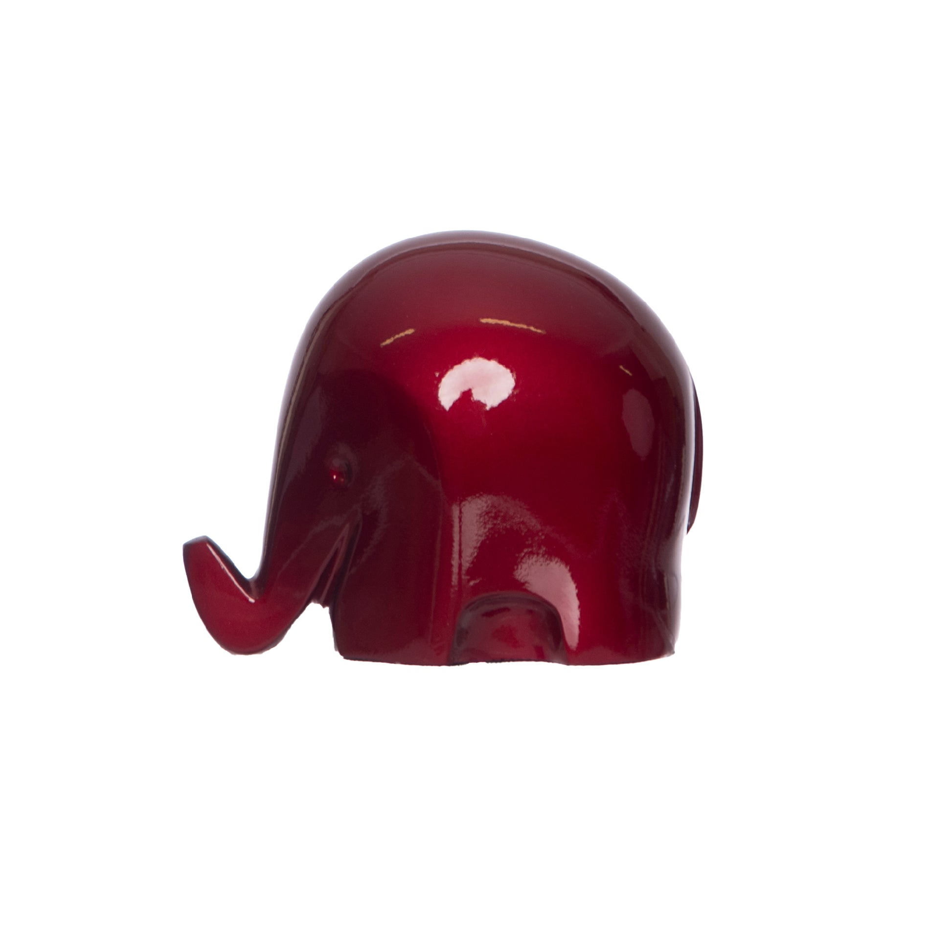 Scultura a forma di elefantino stilizzato realizzato in resina lucida. La sua silhouette è fluida e armoniosa, priva di dettagli superflui, con una testa leggermente inclinata e una proboscide dolcemente arcuata verso l'alto, simbolo di fortuna e prosperità.