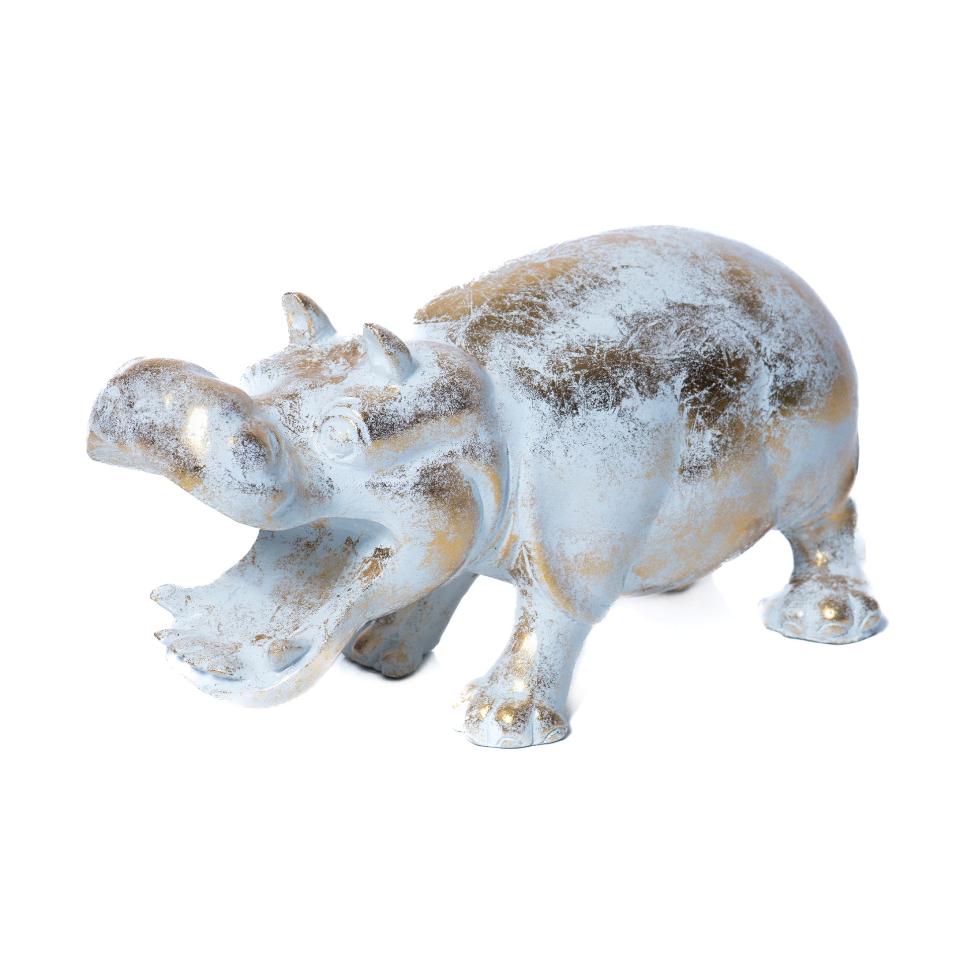 Statuetta in resina a forma di ippopotamo, rappresentato con la bocca aperta, una posa che cattura l'energia e la forza dell'animale. Il design è giocoso e vivace, perfetto per aggiungere un tocco di originalità a qualsiasi spazio.