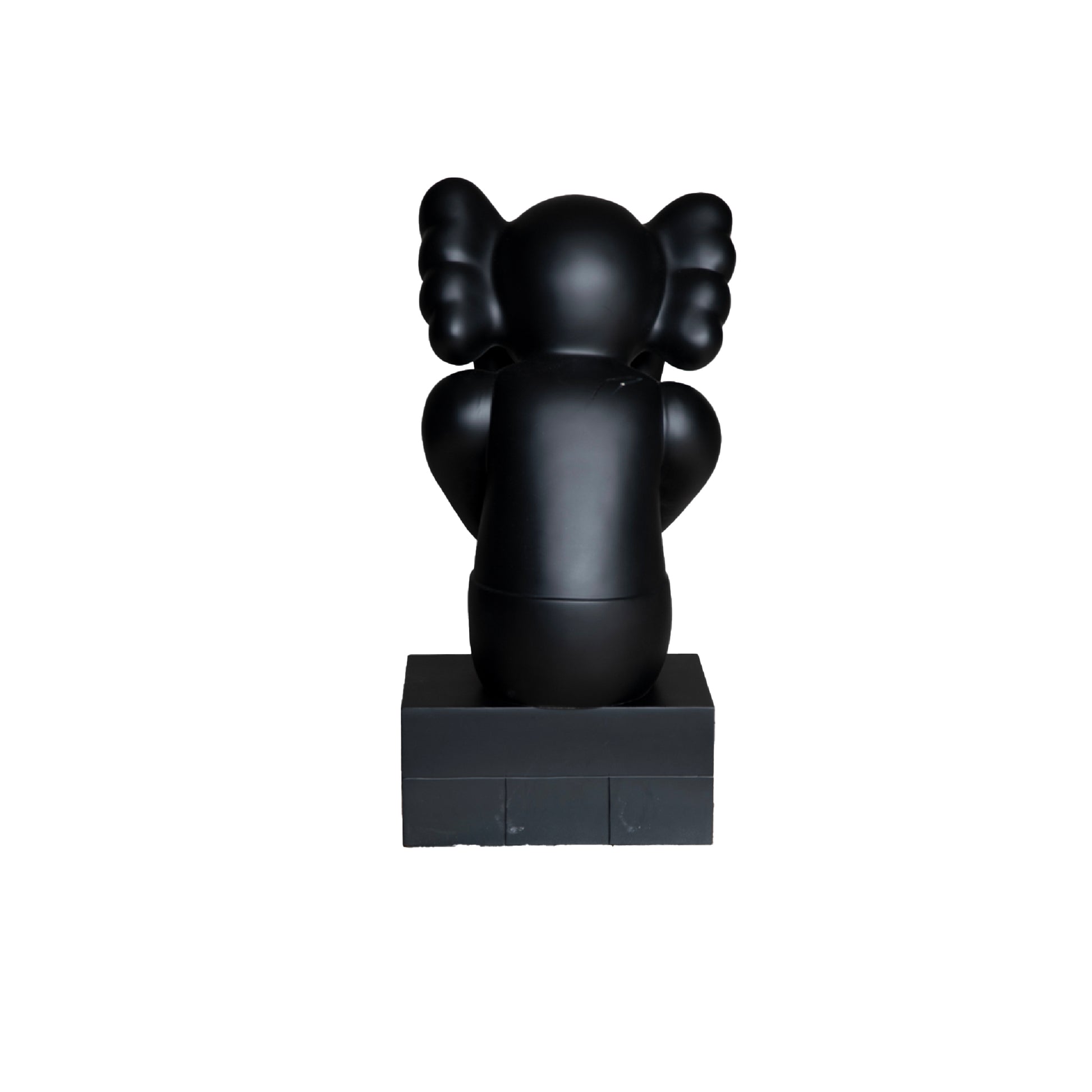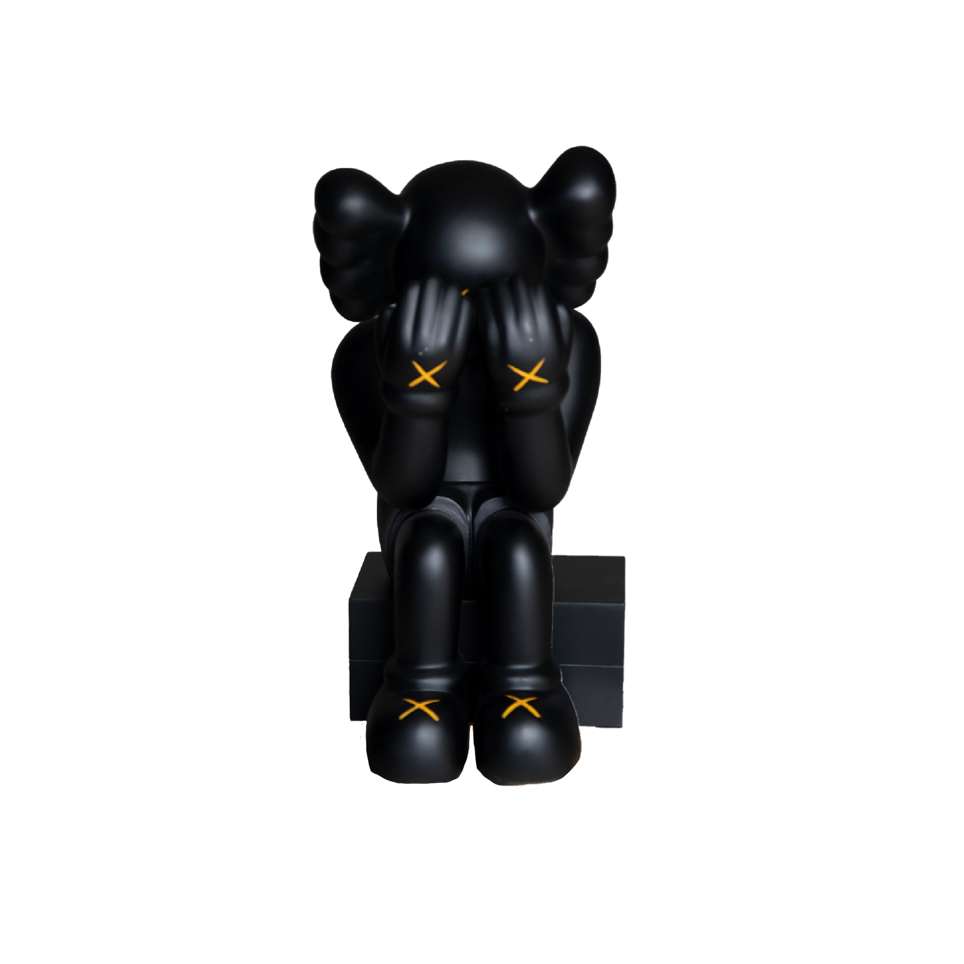 Scultura ispirata ai personaggi iconici dell’artista KAWS. Presenta un design stilizzato con corpo cartoon, mani guantate, occhi a "X" e un’espressione malinconica. La figura è seduta su una base solida, con una postura riflessiva e in total black.