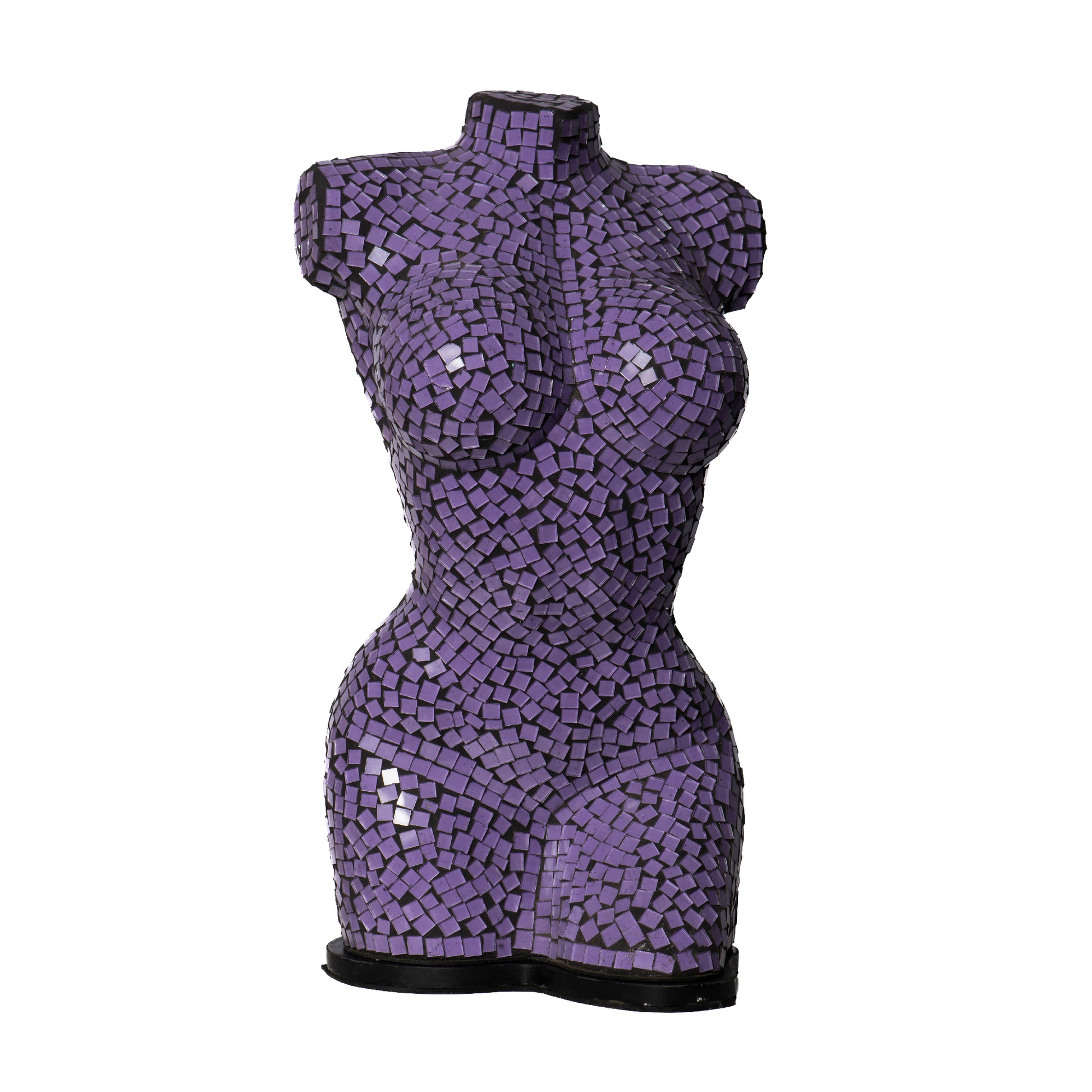 Lampada a forma di busto femminile, elegantemente scolpita, con proporzioni armoniose che risaltano le curve naturali del corpo. Il busto è interamente rivestito da un mosaico di vetro, costituito da minuscoli frammenti di vetro colorato, prevalentemente in tonalità di viola.