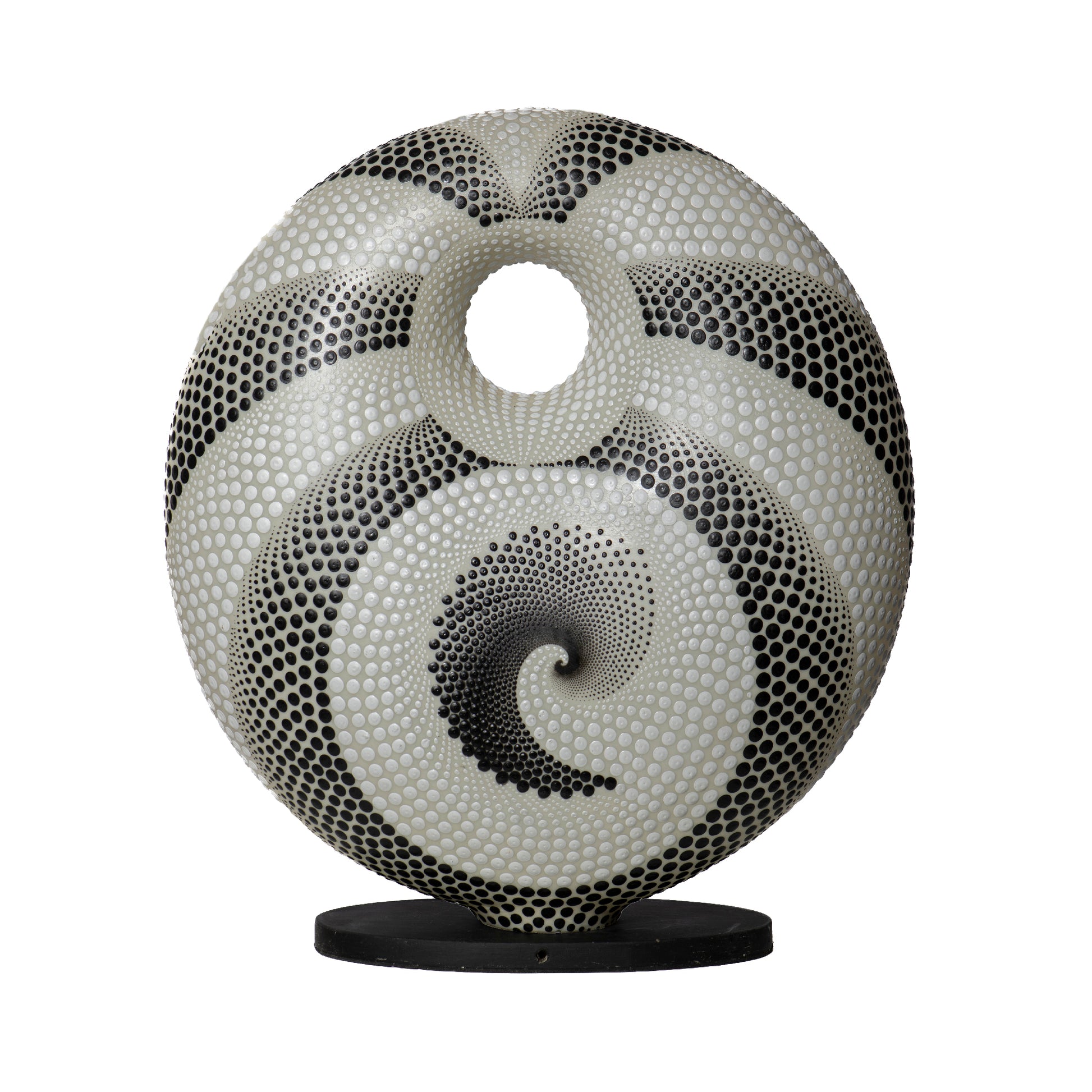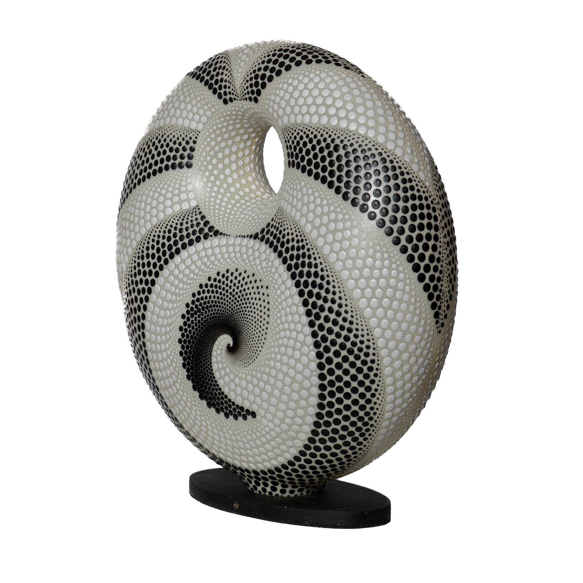 Lampada decorata con la tradizionale tecnica aborigena puntinata, in cui i colori principali sono il bianco e il nero. La base della lampada è avvolta da un complesso e ipnotico intreccio di puntini, tipici della cultura aborigena. Il contrasto tra i puntini bianchi e quelli neri crea un effetto visivo ricco e suggestivo, trasformando la lampada in un pezzo d'arte.
