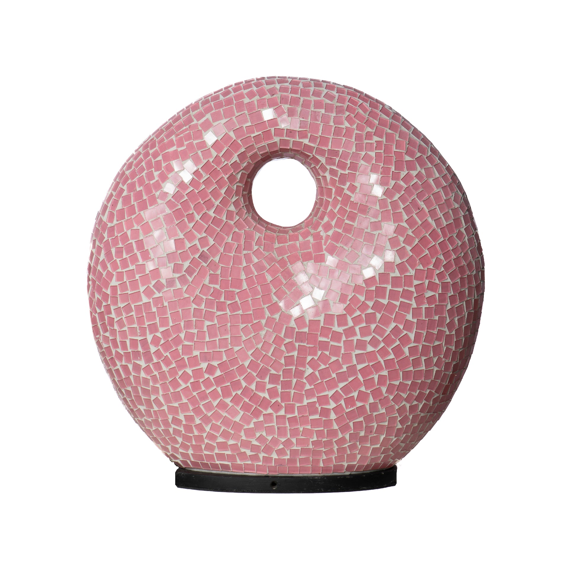 Lampada tonda realizzata con un delicato mosaico di vetro rosa. La superficie è interamente coperta da piccoli frammenti di vetro colorato, perfettamente disposti in un disegno armonioso. Ogni pezzo di vetro riflette la luce in modo unico, creando un effetto scintillante e vibrante.