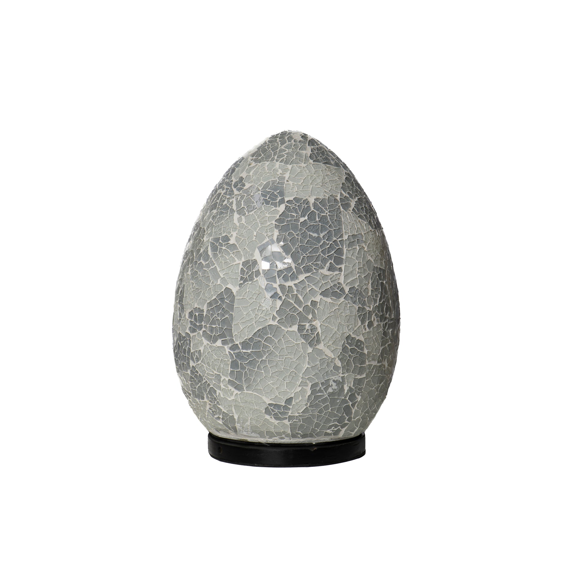 Mini lampada ad ovetto in mosaico di vetro, oggetto decorativo che unisce eleganza e artigianato. La sua forma a ovetto, morbida e arrotondata, conferisce un senso di delicatezza e stile contemporaneo. La superficie della lampada è realizzata con tessere di vetro colorato disposte in un mosaico, che, pur essendo prevalentemente bianco, può presentare sfumature di altri colori e trasparenze, creando giochi di luce unici quando la lampada è accesa.