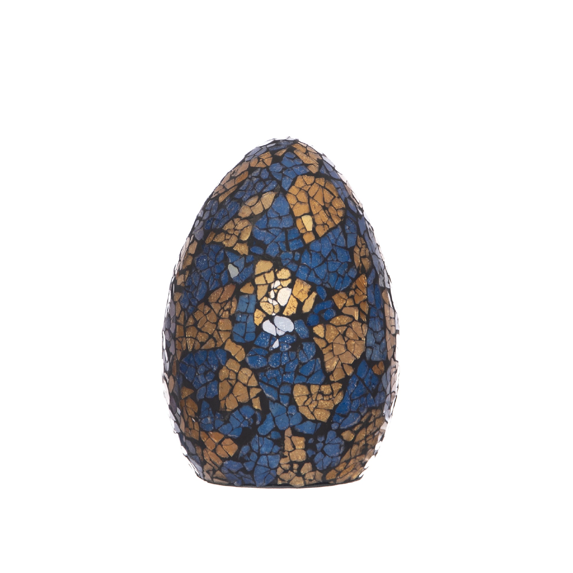 Mini lampada a forma di ovetto, decorata con un mosaico di vetro colorato e resina che crea un effetto luminoso e multicolore. Quando accesa, emette una luce soffusa che proietta riflessi suggestivi.