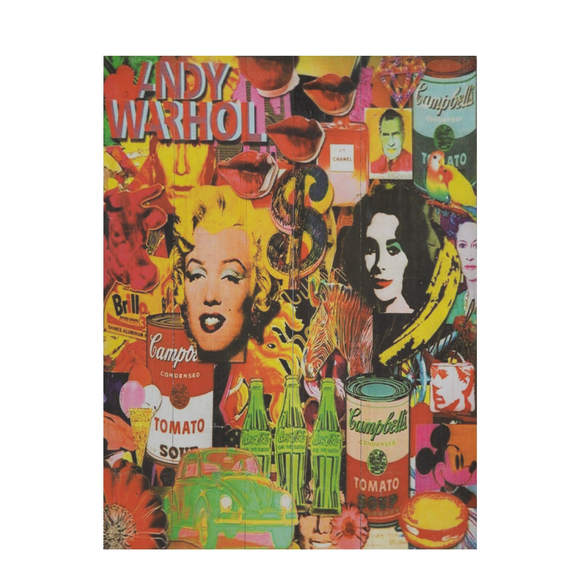 L'immagine su legno in stile pop art ispirata a Andy Warhol. Presenta un collage vibrante con elementi iconici della cultura pop americana, tra cui il volto di Marilyn Monroe, lattine di zuppa Campbell's, bottiglie di Coca-Cola, un simbolo del dollaro e vari altri oggetti colorati.