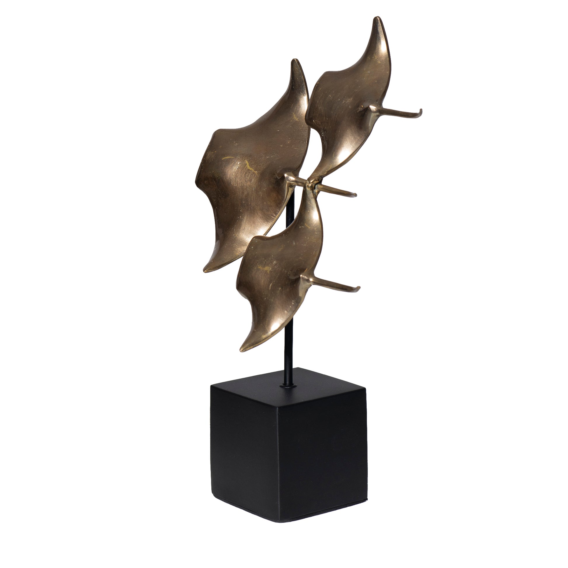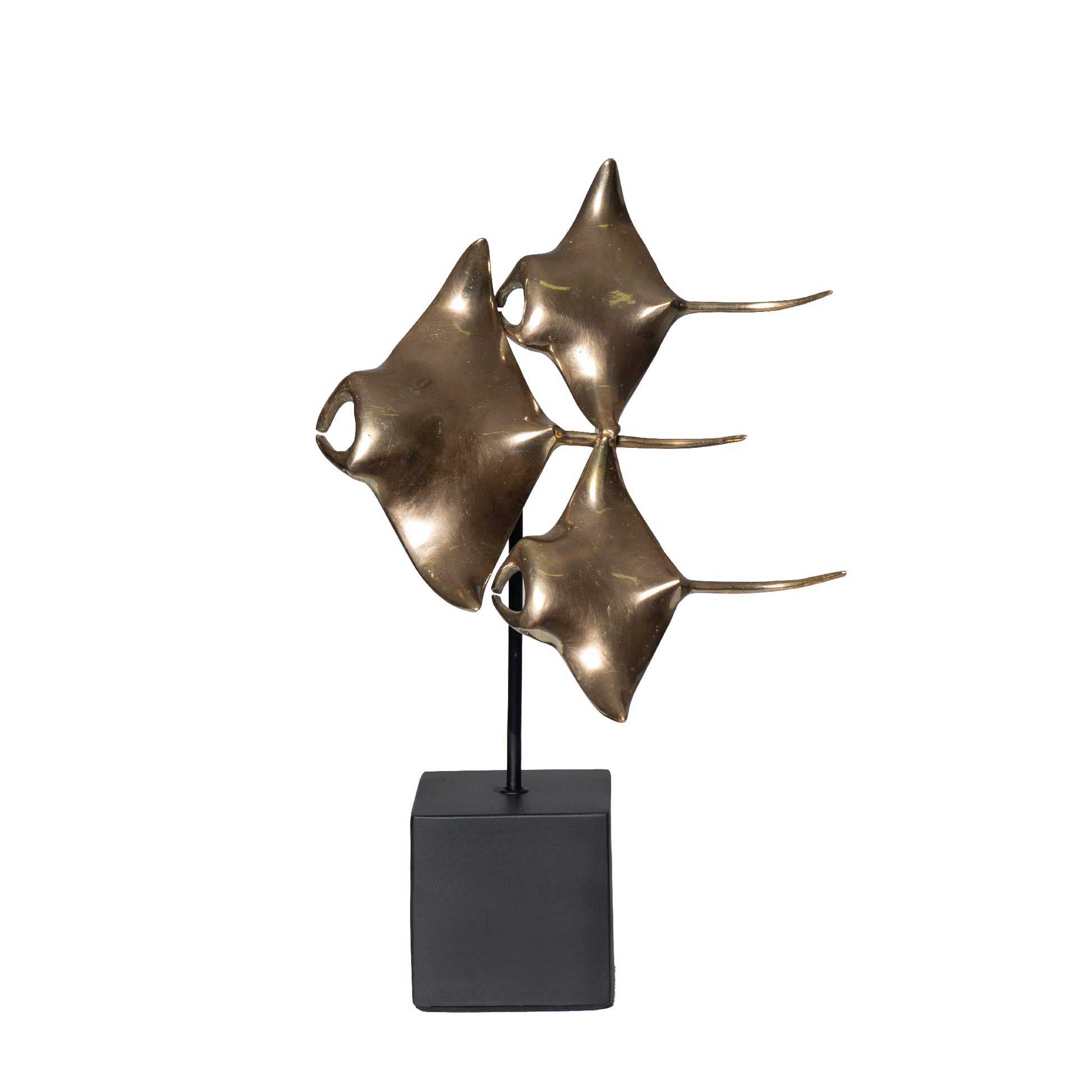 Tris di mante scolpito in bronzo dorato, che catturano la grazia e la fluidità di queste creature marine. Le tre mante sono armoniosamente coordinate, come se stessero nuotando in formazione attraverso le correnti oceaniche.